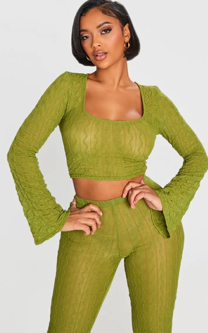 Add some statement hues into your look with this shape olive textured sheer long sleeve crop top. This crop top is brought to you in an olive textured sheer material with long sleeves and a cropped length, what’s not to love? Level up the look and style with the matching bottoms, high heels and accessories for a look that we can’t get enough of.