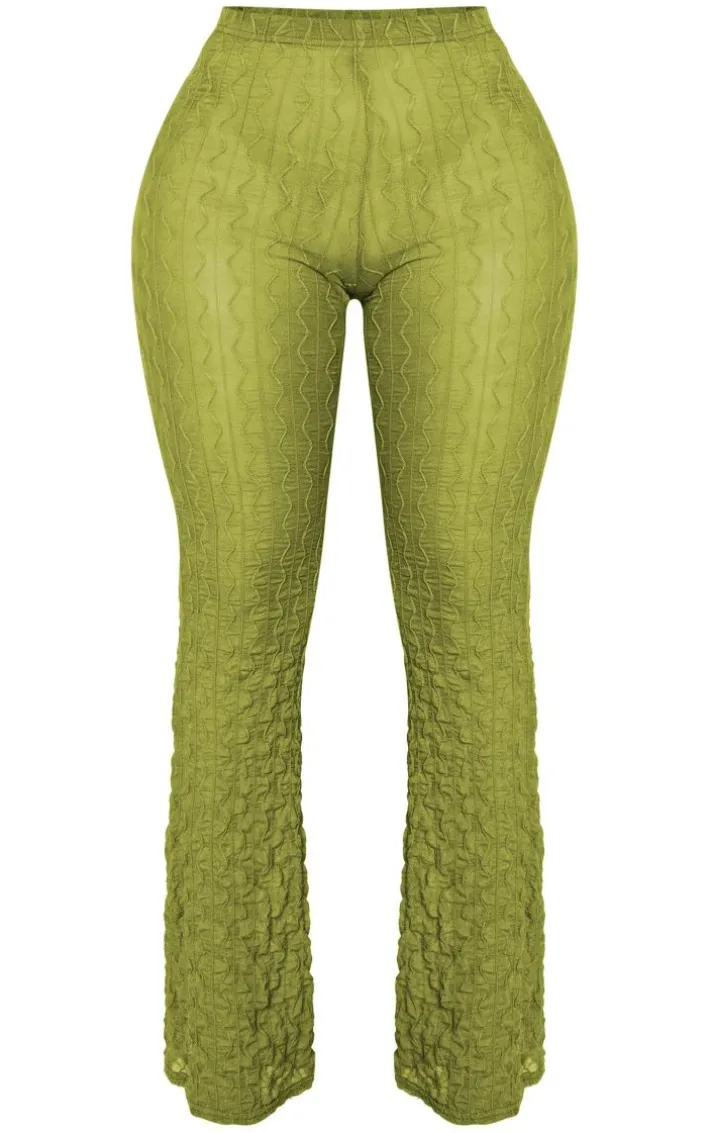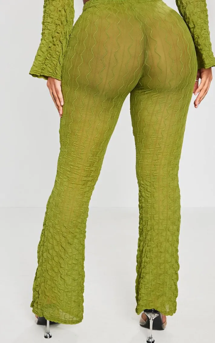 Get ready to have all eyes on you with this shape olive textured sheet wide leg pants. Brought to you in an olive textured sheer material with a high waist and a wide leg fit, whatÂ’s not to love? With itÂ’s statement hue youÂ’ll sure to earn all the likes with this dreamy piece. Finish off the look by pairing this with the matching crop top, high heels and accessories. ItÂ’s a yes from us.