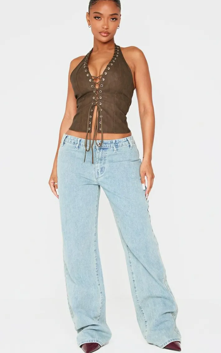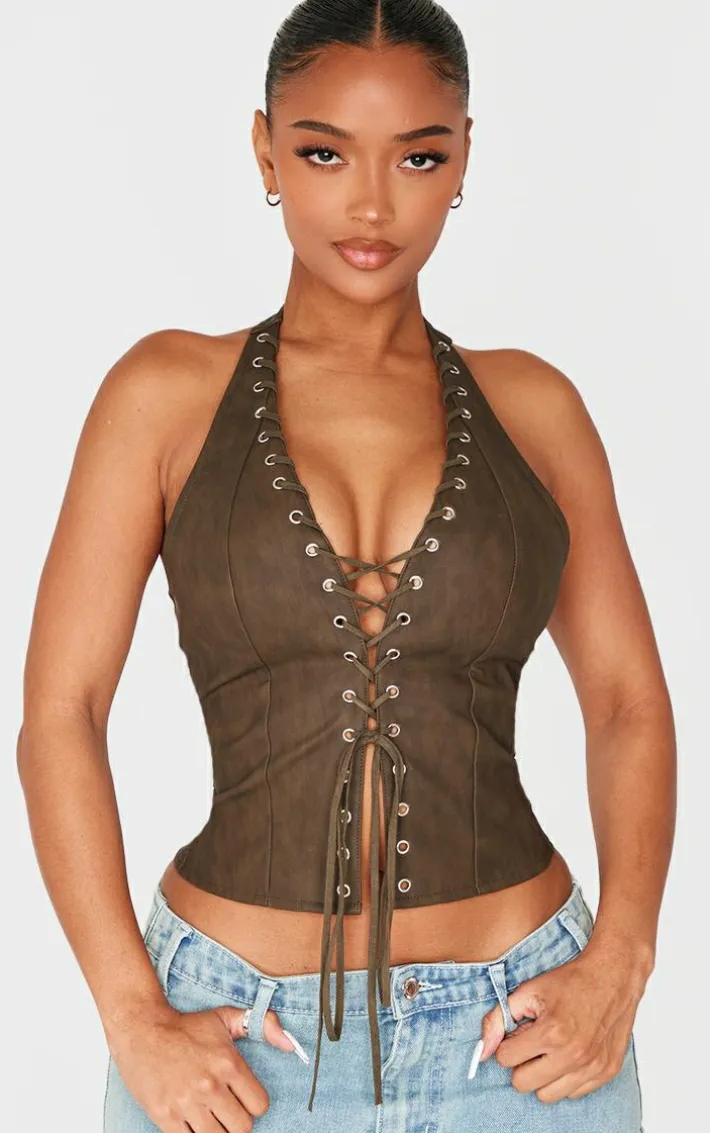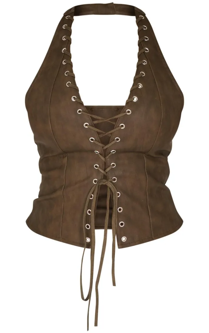 Stay in style with this shape olive washed faux leather halter neck lace up corset. Brought to you in a luxe olive hue, with an edgy washed look, faux leather material and flattering halter neck line, what’s not to love? Team with a pair of jeans and court heels for a look like no other.