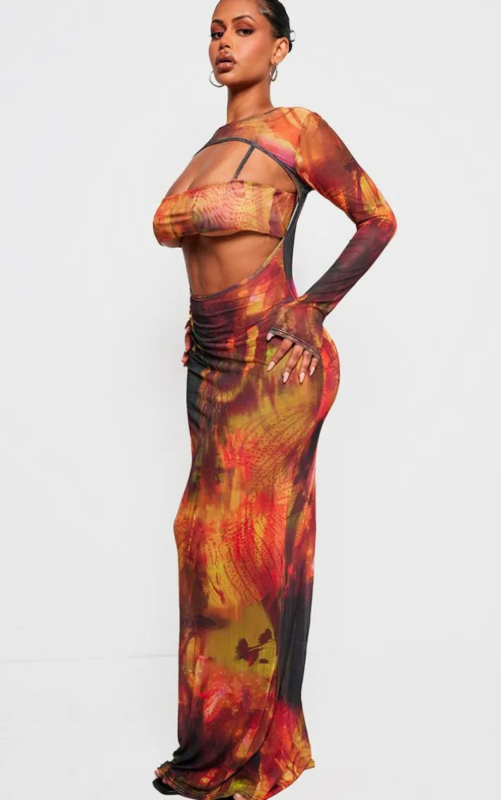 Prepare to have all eyes on you in this shape orange printed mesh open maxi dress with bralet insert. Brought to you in an orange mesh material with an orange print design, a bralet insert and long sleeves, we are obsessed. Style this figure-worshipping maxi dress with heels and gold accessories for an occasion look to be remembered.