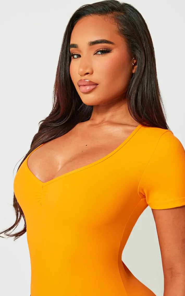 This shape orange sculpted ruched front unitard is here to banish any of your what to wear dilemmas. Brought to you in an orange material with a ruched front and a figure-hugging fit, we canÂ’t get enough. From start to finish this unitard will have you looking totally on-trend. For a next-level look simply style with high heels and accessories for a look that will have you setting trends wherever you step foot.