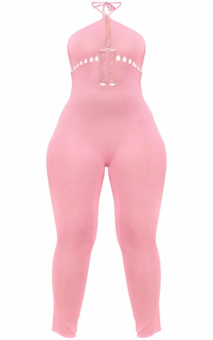 Have heads turning for all the right reasons this weekend with this shape pink knit sheer halterneck jumpsuit, you won’t be able to resist. With a pink sheer knit material, a halterneck design and a figure-flattering fit, you’ll be adding this shape jumpsuit straight to your basket. Pair with clear slip-on heels and your biggest hoop earrings for the ultimate fierce vibe.