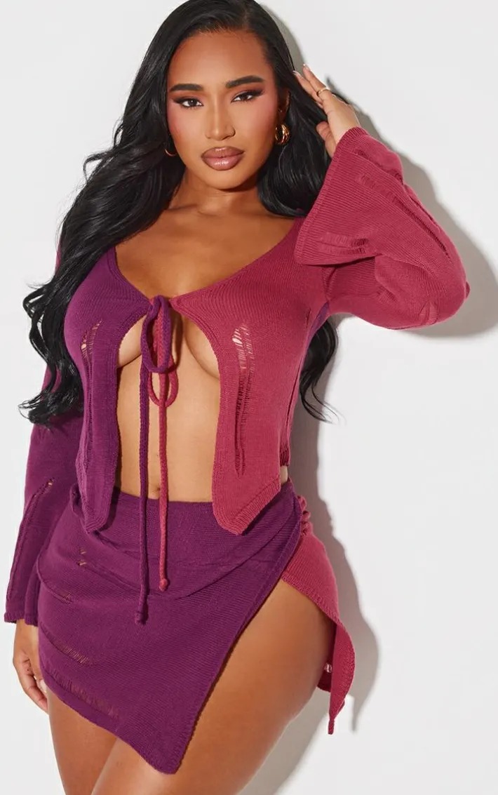 This shape plum contrast knit tie top is a must-have for any occasion. With a dreamy plum hue, contrast detail, tie design and knit material, you really can’t go wrong with this. Dress up or down for an unreal outfit, and style with the matching skirt with your fave heels for a look that won’t go unnoticed.