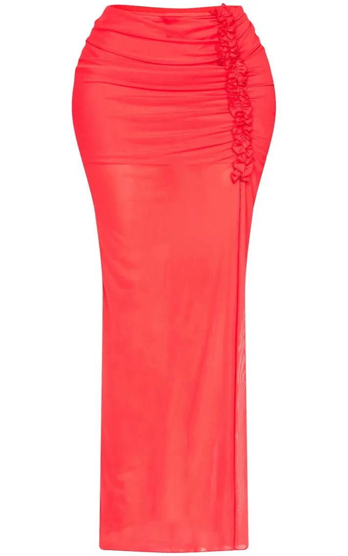 Step out in style with this shape red low rise frill detail side split maxi skirt. Brought to you in a red material with a low rise fit and a frill detail, this maxi skirt is the perfect addition to your weekend wardrobe. Team with the matching top and a pair of heels for an outfit we are loving.
