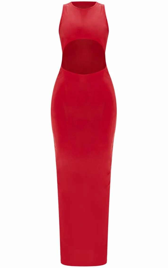Get ready to have all eyes on you with this shape red slinky cut out front maxi dress. Brought to you in a red slinky material with a cut out front, whatÂ’s not to love? With its maxi length, youÂ’ll sure to earn all the likes with this dreamy piece. Finish off the look by pairing this with some clear heels and your fave accessories. ItÂ’s a yes from us.