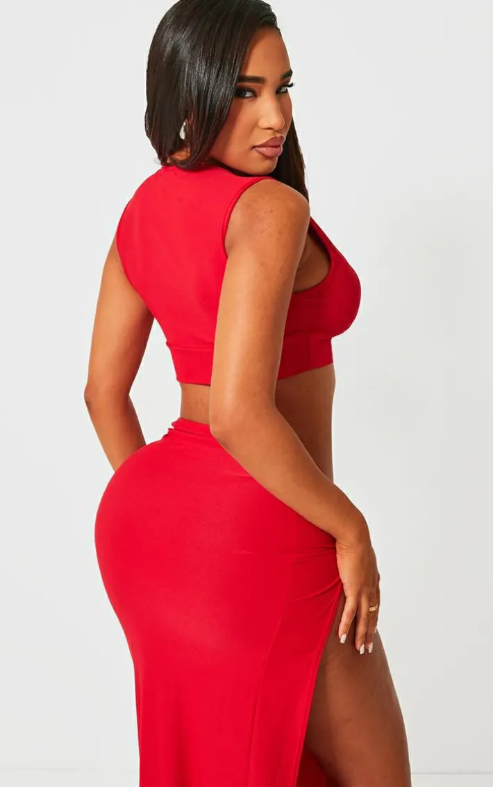 Turn up the heat on your weekend wardrobe with this shape red slinky racer crop top, you’re sure to be at the center of attention. This shape top features a red slinky material with a racer style and a cropped length, what more could you want? Pair with the matching skirt, heels and a shoulder bag for a fierce finish.