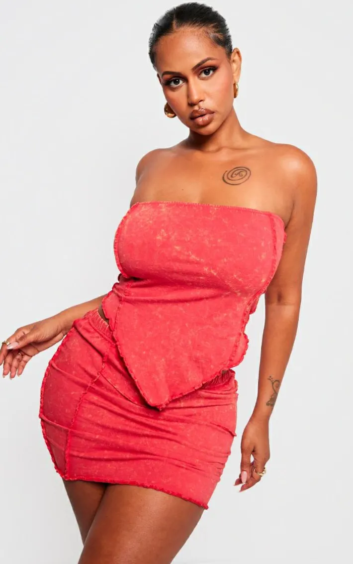 Make heads turn for all the right reasons in this shape red washed cotton seam lettuce hem skirt. Brought to you in a red washed cotton material with a lettuce hem design and seam detailing, how can you resist? Pair this red skirt with the matching top, heels and gold accessories for a look worthy of your weekend plans.