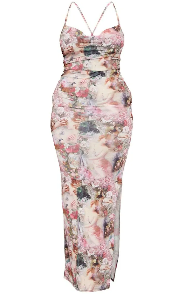 Give your look a serious update with this maxi dress. Featuring a rose femme renaissance print material with a cowl neck design and a maxi length, what’s not to love? Style this with barely-there heels and minimal accessories for an occasion worthy combo we’re loving.