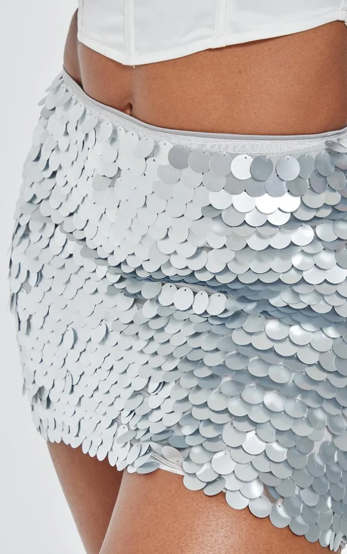 When the weekend calls for a little drama this shape silver disc sequin micro mini skirt will have you at the center of attention. It is made using a silver disc sequin material with a micro mini length and a figure-hugging fit, what more could you want ? Style this with the matching top, silver high heels and statement accessories to elevate the look further