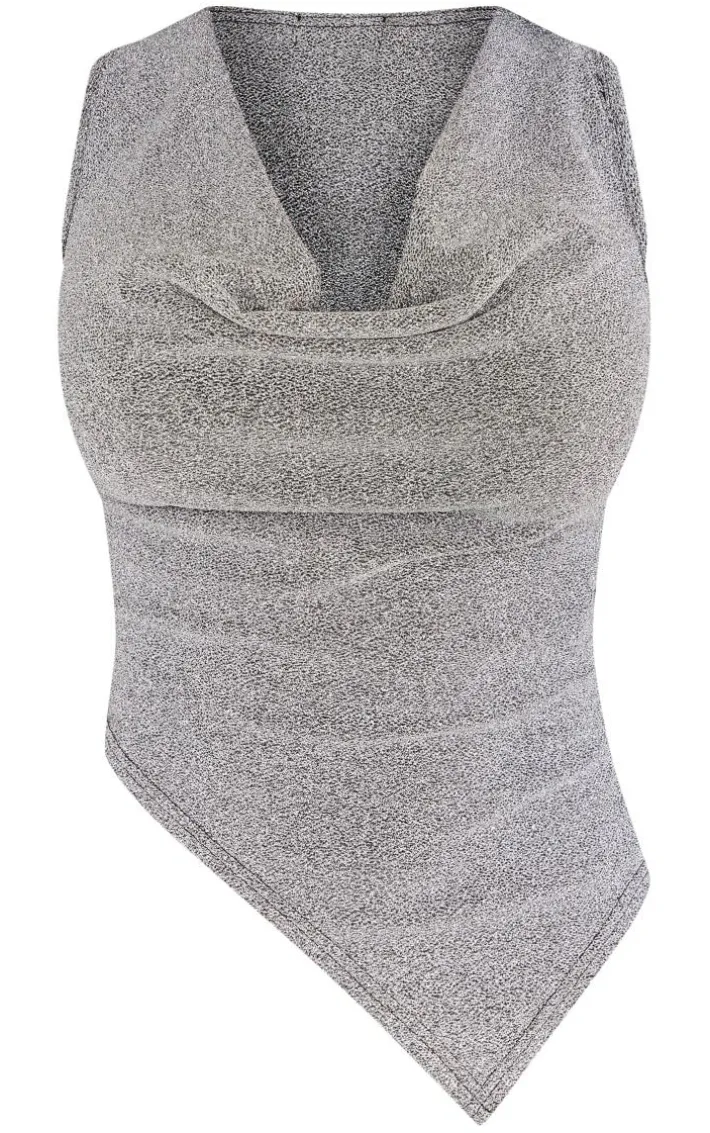 Get ready to have all eyes on you with this shape silver glitter cowl neck asymmetric top. This top is brought to you in a silver glitter material with a cowl neck and an asymmetric hem, what’snot to love? With it’s statement hue you’re sure to earn all the likes with this dreamy piece. Finish off the look by pairing this with the matching mini skirt, high heels and silver accessories. It’s a yes from us.