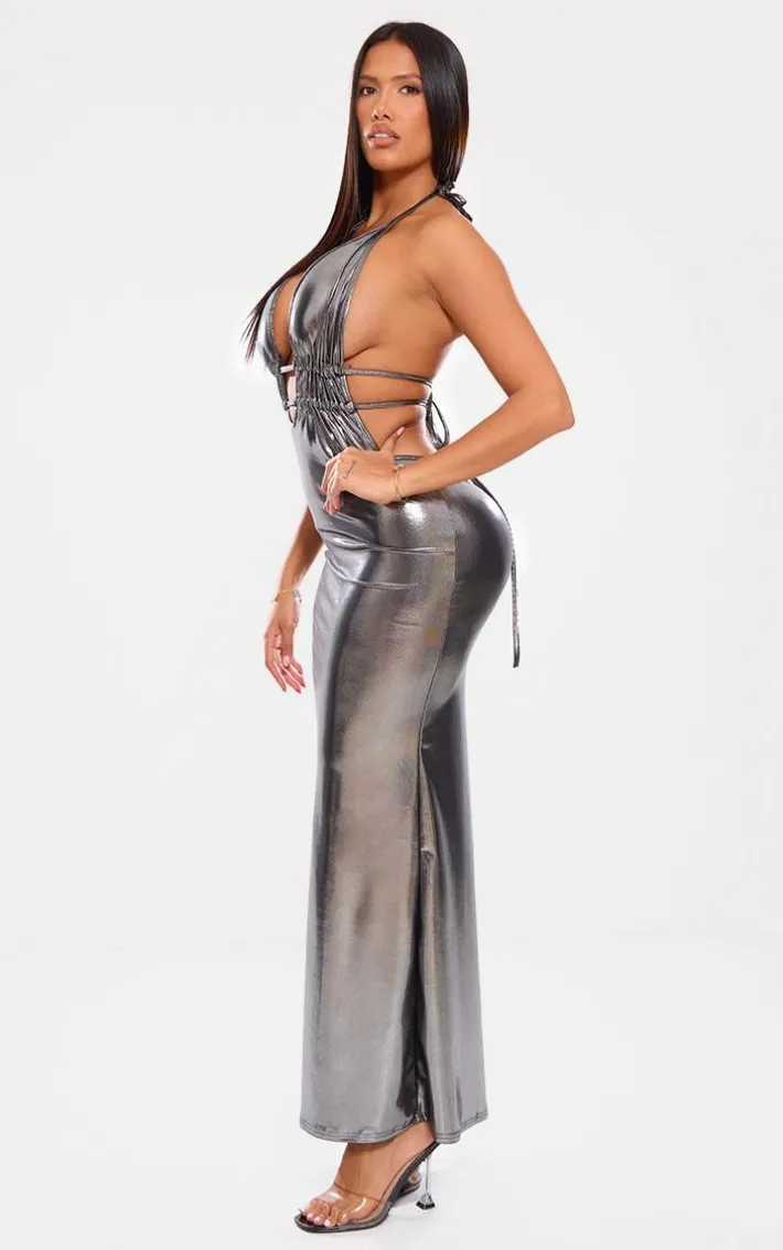 Make a statement with this shape silver metallic wet look plunge front halter neck maxi dress. Brought to you in a metallic silver hue, with a wet look design, flattering plunge front and halter neck line, opt for this for your next occasion. Style effortlessly with minimal accessories and a pair of heels for a fool proof finish.