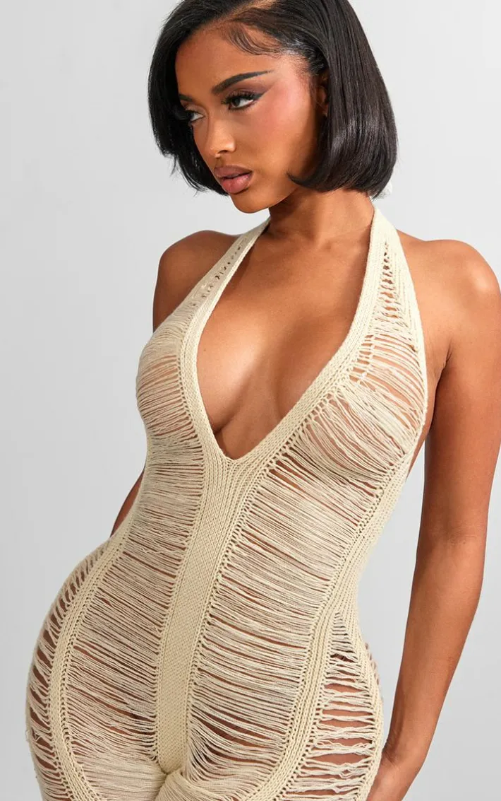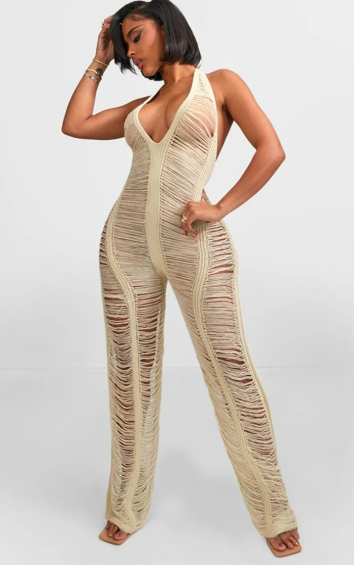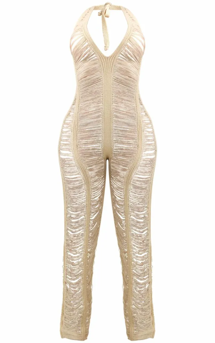 Your new season wardrobe is calling out for this shape stone knit ladder halterneck jumpsuit. Brought to you in a stone knit material with a ladder detail and a halterneck design, you will be tapping into your feminine side no matter what. Team with a pair of heels and accessories of your choice to finish off the look.