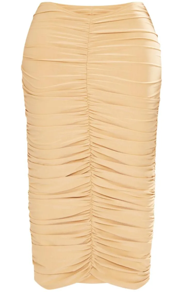 Get ready to add some drama to your weekend wardrobe with this shape stone ruched detail midaxi skirt. Brought to you in a a stone hue material with a ruched design and a flattering midaxi fit, what more could you need? Style this shape midaxi skirt with a crop top, clear strap heels and statement gold accessories for a look that is sure to steal the stares for all the right reasons.
