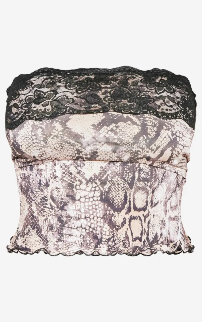 Take on the weekend in style with this shape stone slinky lace trim snake print bandeau. With its stone hue, statement snake print design and luxe lace trim detail, how can you not love? The slinky material is sure to give a figure-flattering fit, so style with the matching hot pants for a look that won’t go unnoticed.