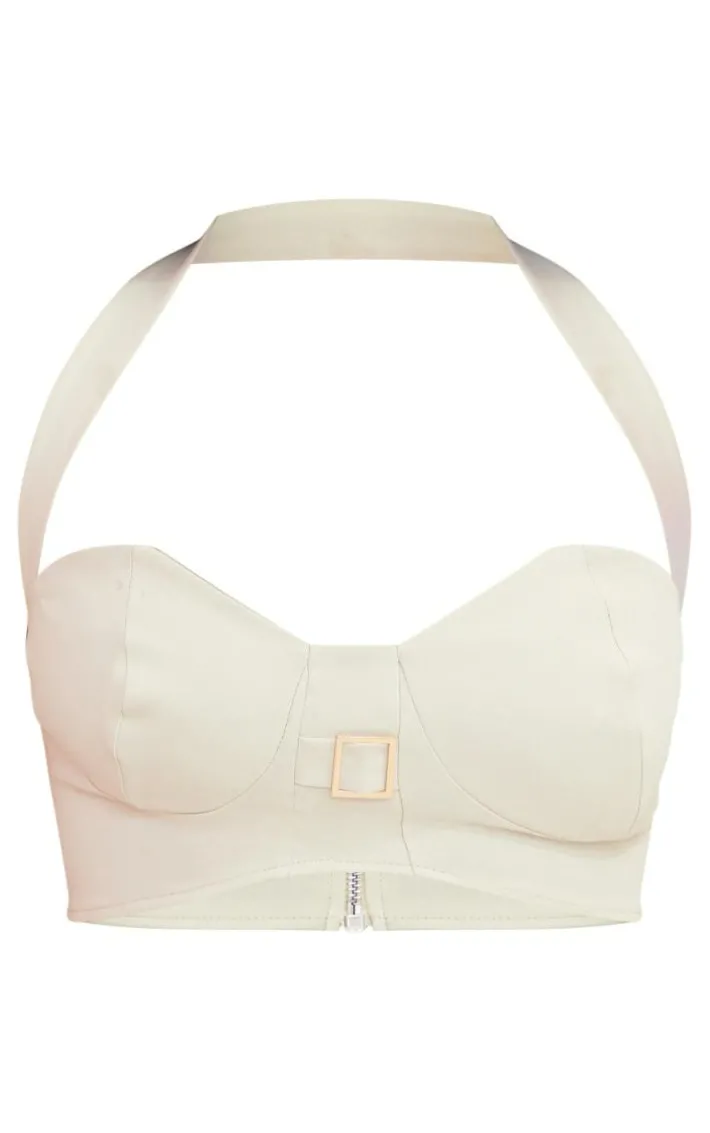 Get ready to nail new season trends with this unreal top. Featuring a stone stretch woven material with a buckle detail, a halterneck and a cropped length, what’s not to love? Simply pair with the matching bottoms, high heels and gold accessories for a vibe that will get you noticed.
