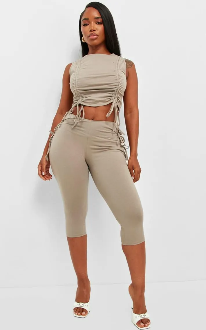 Set major trends with these shape taupe cotton tie detail capri leggings. Brought to you in a taupe cotton material with a tie detail giving you a flattering fit that will have all eyes on you. These capri leggings pair perfectly with the matching crop top and your fave heels for a fool proof finish that will earn you all the styling points.