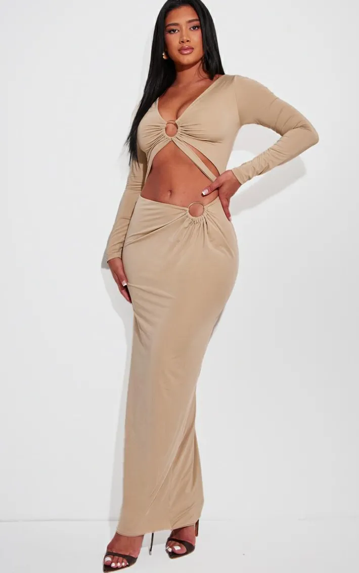 Get your glam on with this shape taupe slinky cut out ring long sleeve maxi dress. Made from a taupe slinky material with a cut-out front, ring detail, long sleeves and a floor-sweeping maxi length, youÂ’re sure to have all eyes on you. When the weekend calls so does this maxi dress. So what are you waiting for? Shop the look and opt for high heels and accessories for a look like no other.