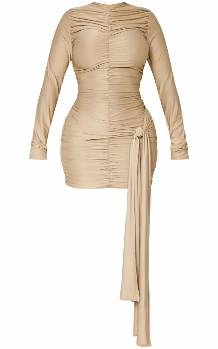 Keep your style game strong with this shape taupe slinky ruched detail long sleeve bodycon dress. Brought to you in a taupe slinky material with a ruched detail and a long sleeve fit, you won’t blend in. Pair it with a pair of court heels and your go-to accessories for a combo that can be dressed up or down.