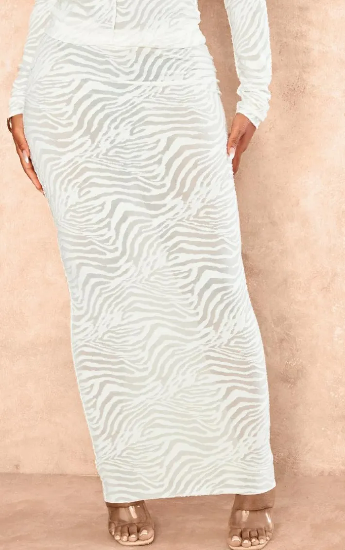 Turn heads this season with this shape white flocked mesh maxi skirt. Brought to you in a white flocked mesh material with a maxi length, what’s not to love? For a matching vibe, style this maxi skirt with the matching top, heels and statement bag for an unreal look.