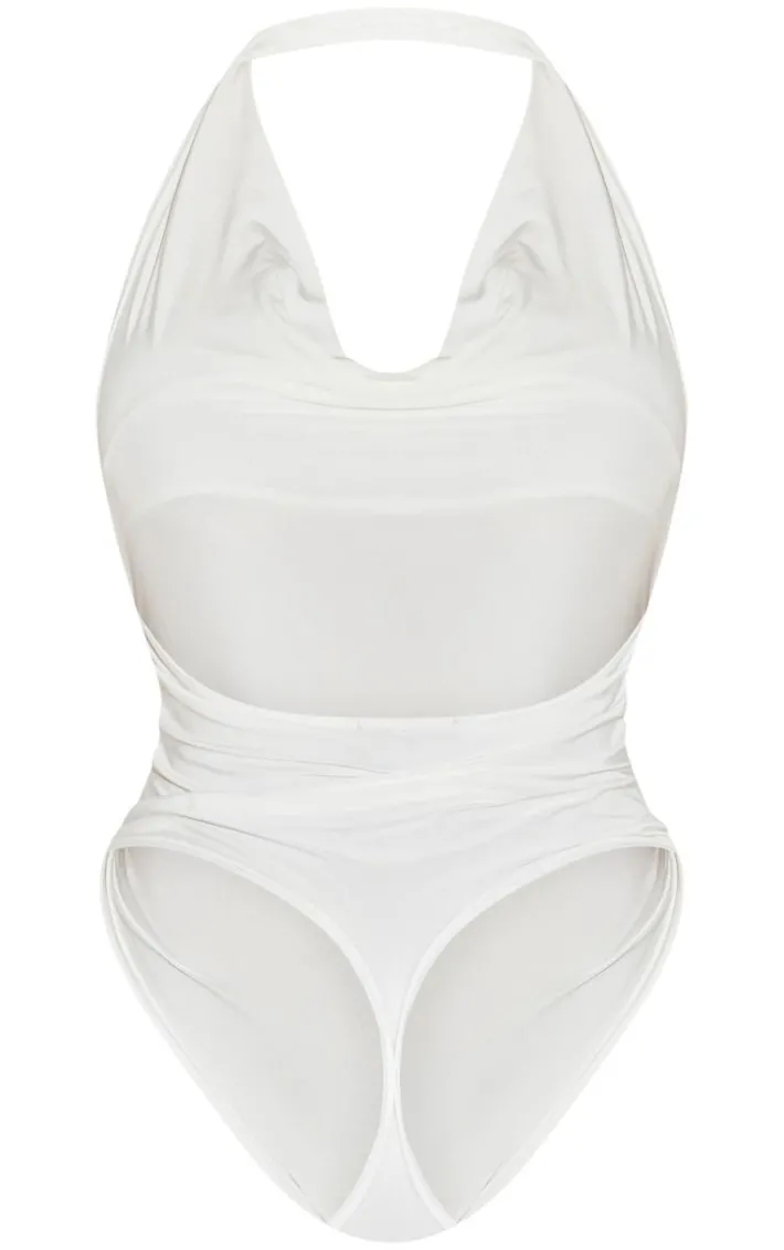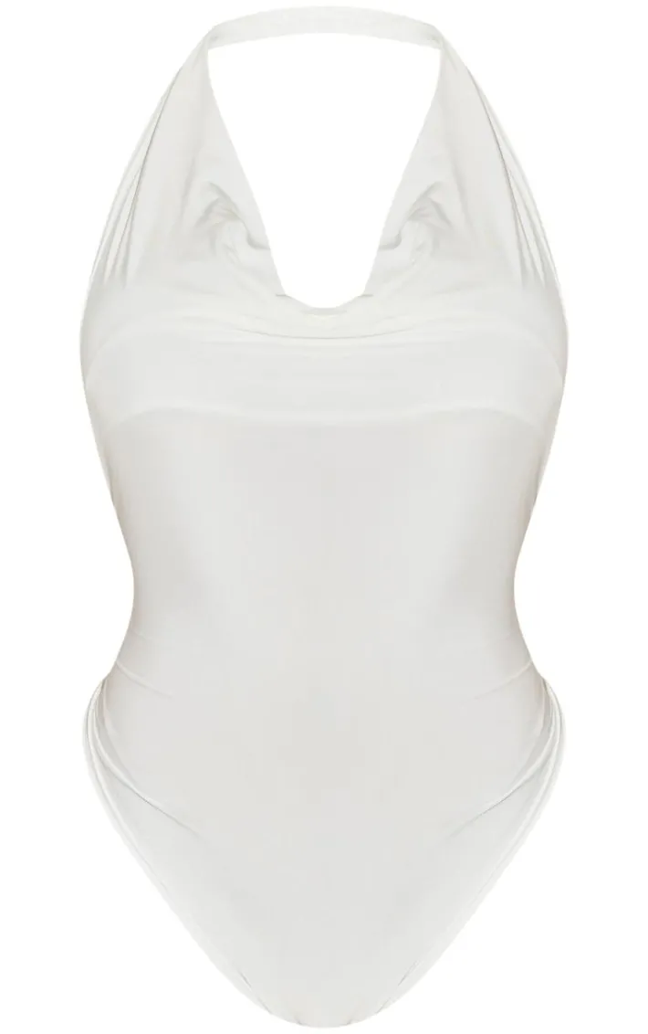 Look all kinds of chic in this shape white halter cowl neck open back bodysuit. Brought to you in a white hue material with a halter cowl neckline and open back design, this bodysuit is a yes from us. How can you resist? Style with blue jeans, heels and your fave accessories for a chic finish perfect for dressing up or down.