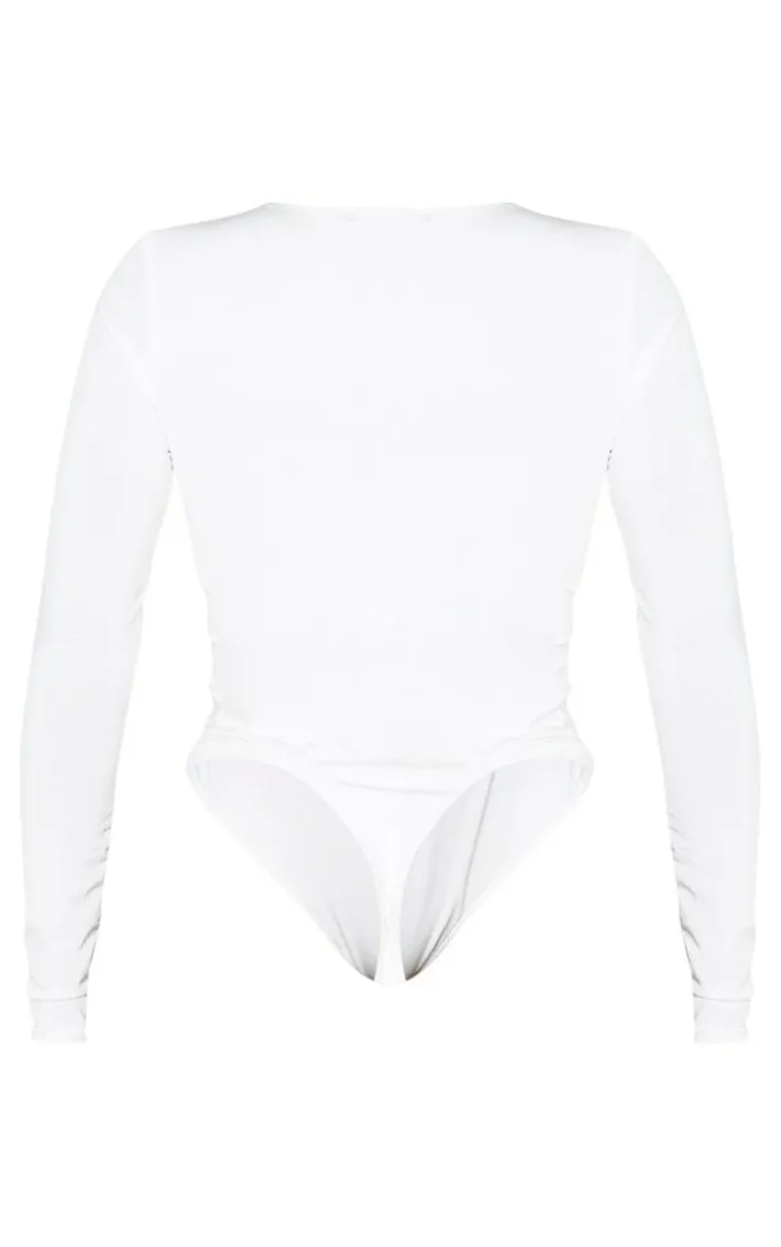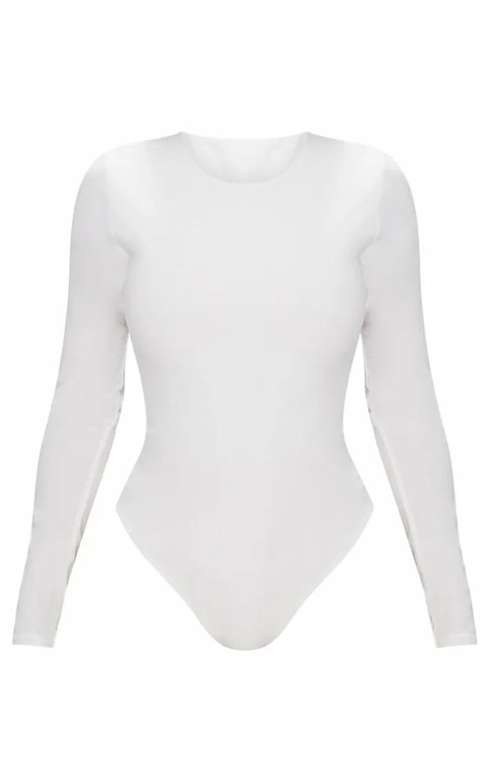 Give your look a refreshing hit of white with this simple streamline bodysuit. Featuring a white slinky material, long sleeves and popper fastenings, team it with some popper sweatpants and heels for a look with some serious attitude.