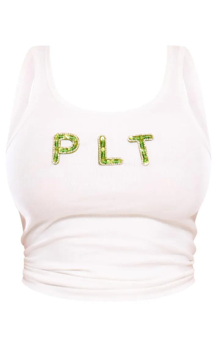 Introducing your new staple with this shape white PLT sequin embellished vest top. Brought to you in a white hue material with a ‘PLT’ sequin embellished design, this vest top is a must have. Style with hot pants, heeled boots and simple accessories for a chic finish everyone will be asking about.