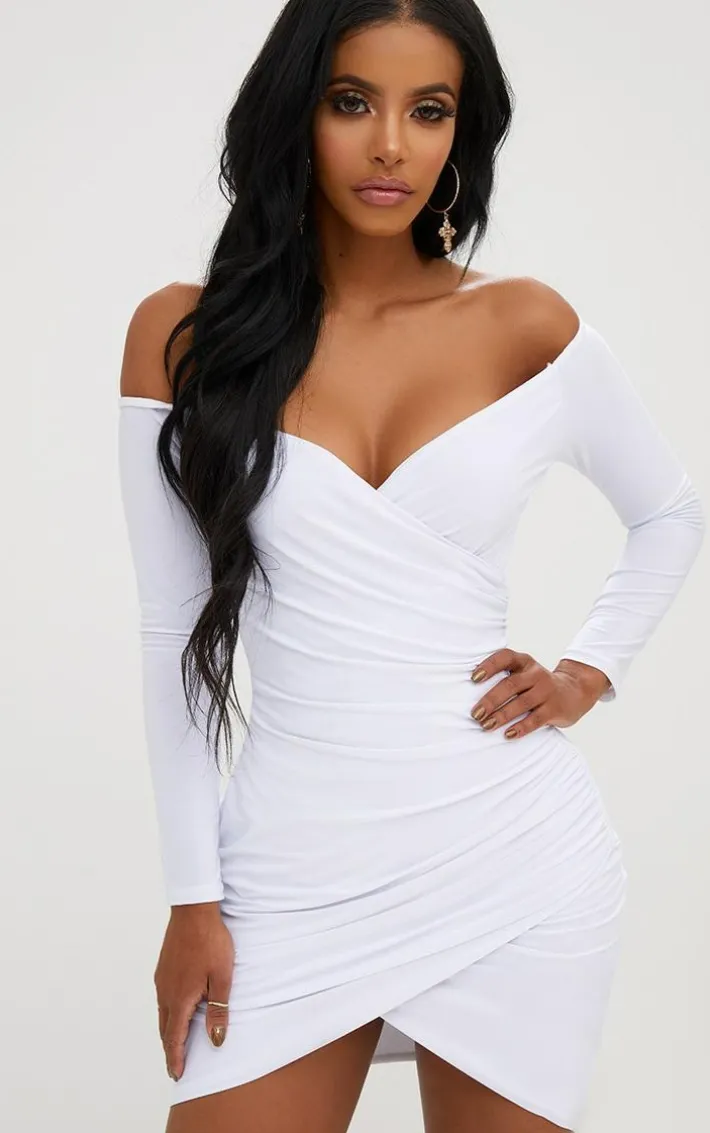 Flaunt your figure in the ultimate white bardot bodycon dress, featuring flattering ruched side and slinky figure hugging fabric. Team with barely there heels and oversized earrings for a firinn’ look.