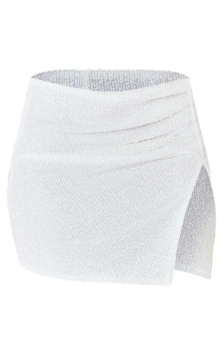 Got a special occasion penciled into your diary? Well, we’ve got you covered with this shape white sequin ruched side low rise micro mini skirt. Brought to you in a white sequin material with a ruched design, how could you say no? This micro mini skirt has a low rise fit that will have you setting trends wherever you step foot. For a flawless finish team this with the matching top and a pair of heels. It’s everything we’re loving right now.