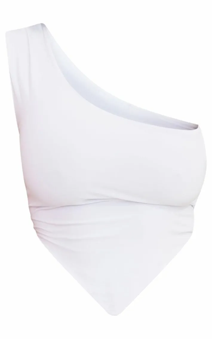 Take your vibe to a whole new dimension with this must-have crop top. Featuring a white slinky material with a one shoulder design, a curved hem and a flattering fit, we are in love. Wear with cargo bottoms high heels and accessories for a look that will get everyone talking.