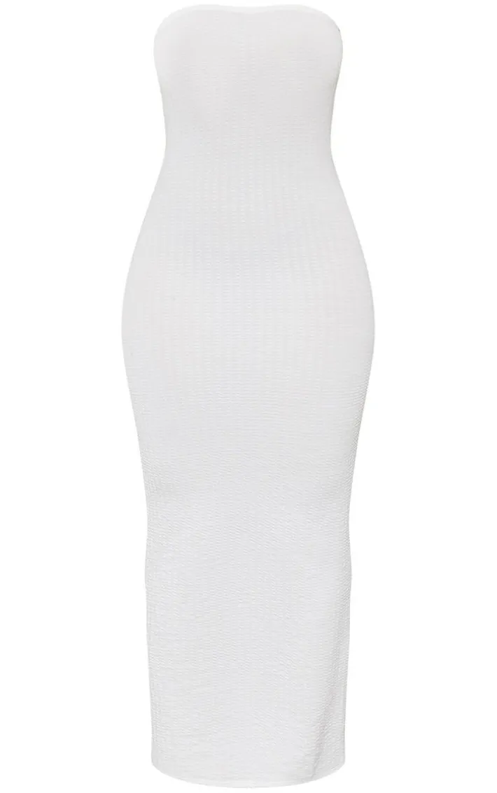 Add some freshness to your weekend look with this dress. Featuring a white textured material with a bandeau neckline and a midaxi length, we are in love. Style with a shoulder bag and heeled mules to keep all eyes on you.