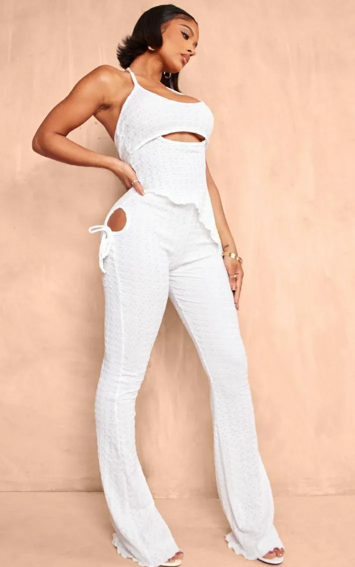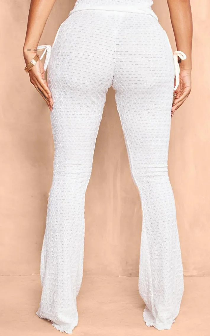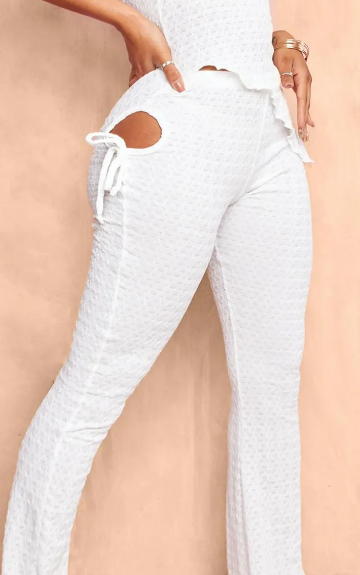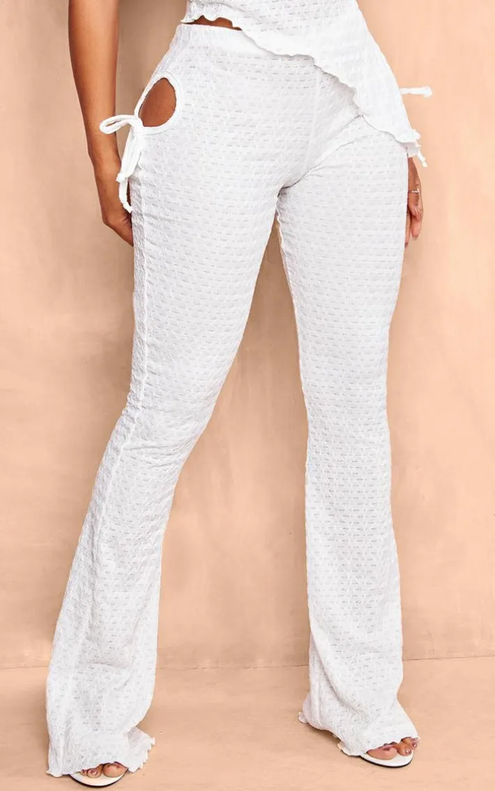 Switch up your weekend style game with these shape white textured cut out flare pants. Brought to you in a white textured material with a cut out design and a figure-flattering flared leg fit, what more could you want? Pair these flare pants with the matching top, heels and gold accessories for a look that is sure to make heads turn wherever you go.