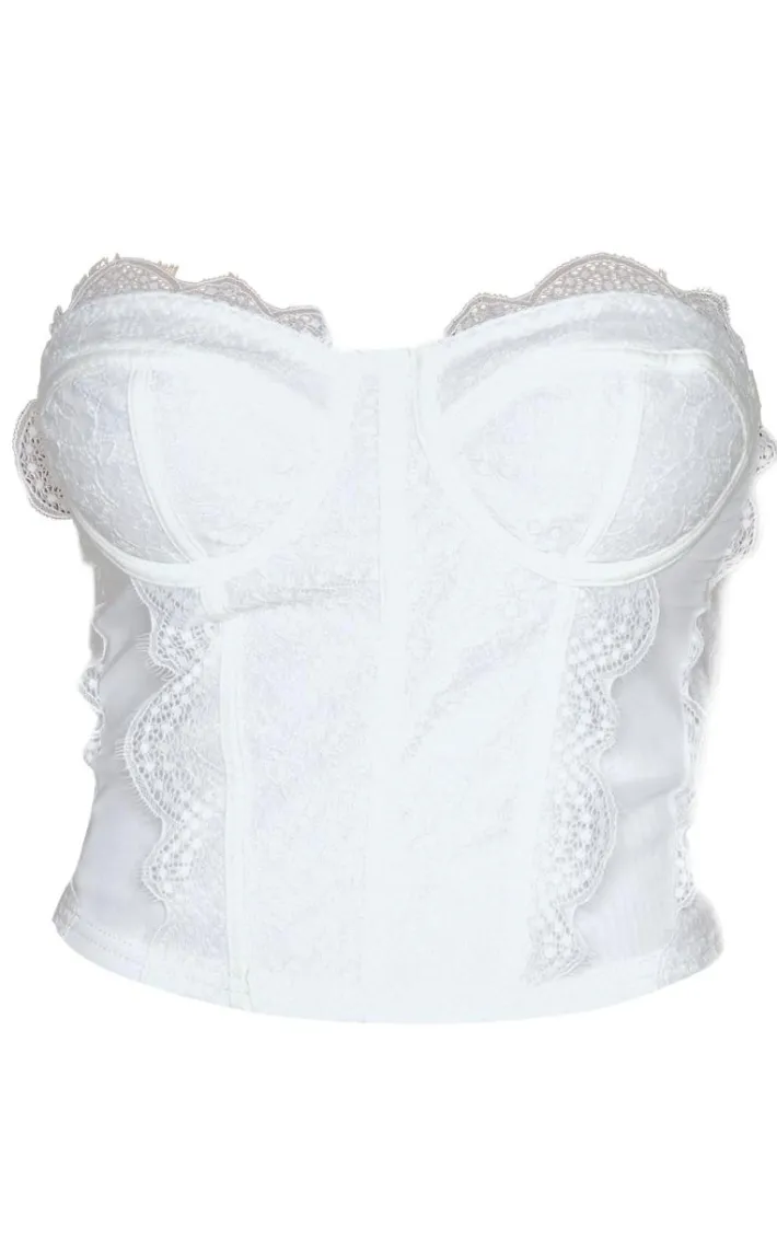 Amp up your weekend wardrobe with this shape white woven lace bandeau corset. Brought to you in a white woven lace material with a bandeau neckline, this corset is a must-have. Style with a maxi skirt, statement heels, and gold accessories for a look we’re crushing on this season.