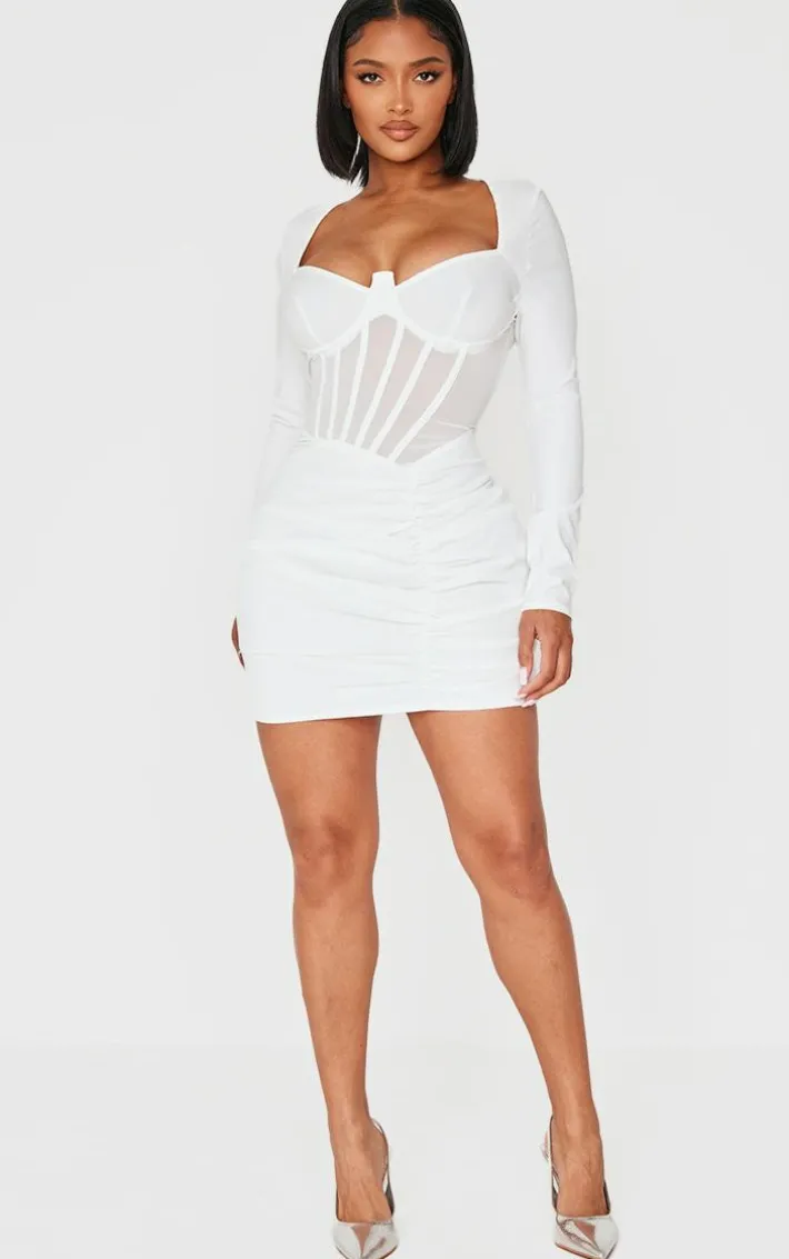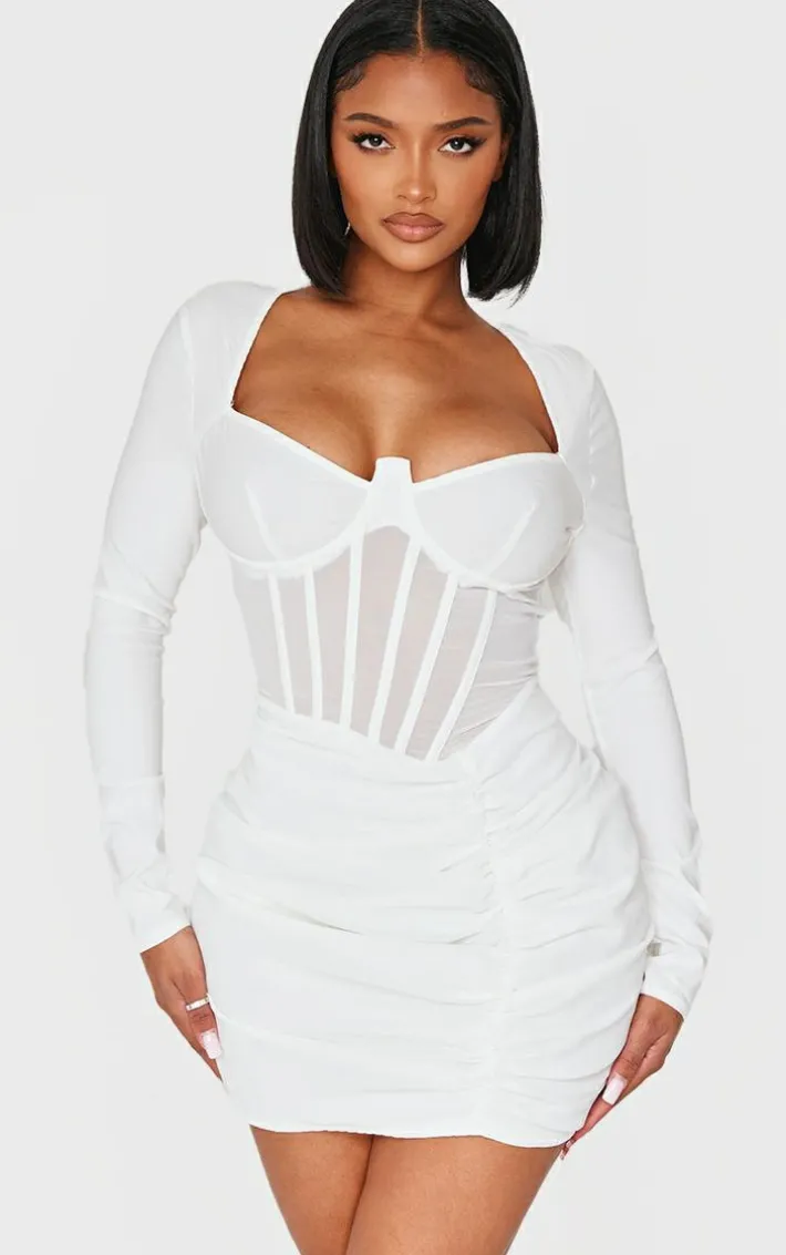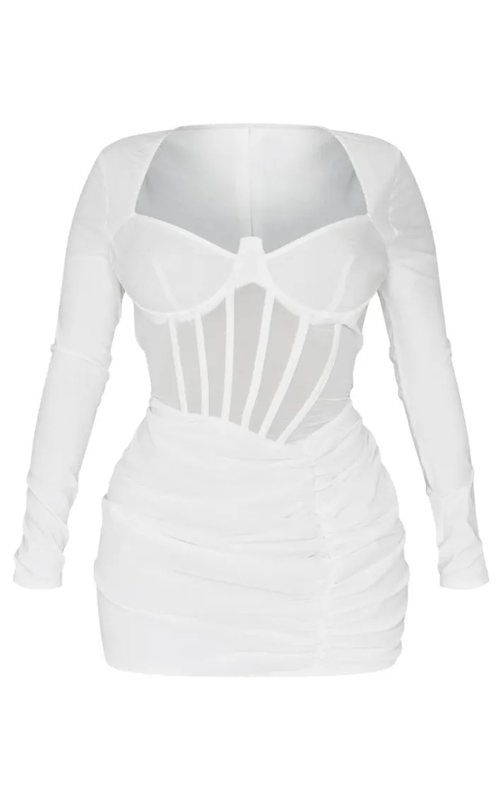Turn heads in this shape white mesh insert corseted ruched side mini dress. Brought to you in a white mesh material with an insert design and a corseted ruched side, we are seriously obsessing over this mini dress. Team with your fave gold hoops and court heels for as fool proof finish.