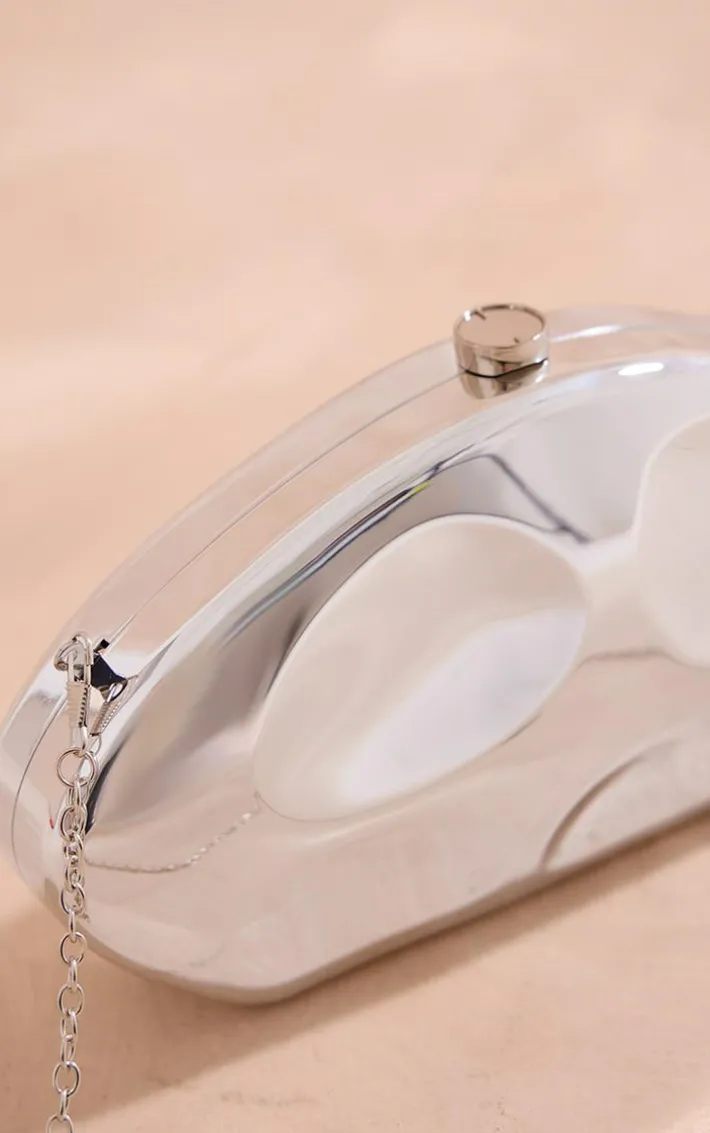 Bring all the glam vibes to your weekend look with this silver abstract oval hard clutch bag. Made from a silver material with an abstract design, and a hard oval shape, what more could you want? Style this clutch bag with a statement outfit for the perfect finishing touch to any look.