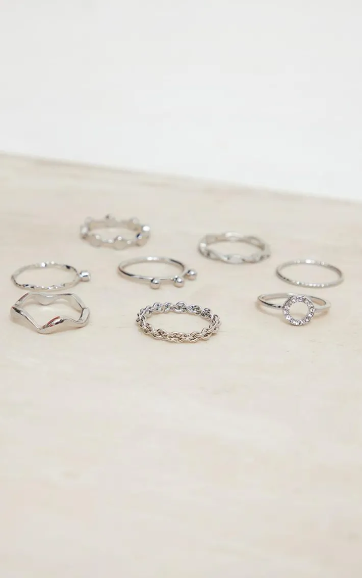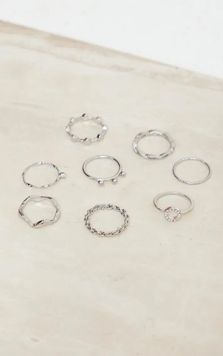 Elevate your outfit of the day with ease with these silver assorted shape twist ring set, you won’t be able to resist. This set features 8 rings all in a silver hue material with assorted shapes and twist detailing, what’s not to love? Pair this ring set with any new season fit for an effortlessly chic finish.