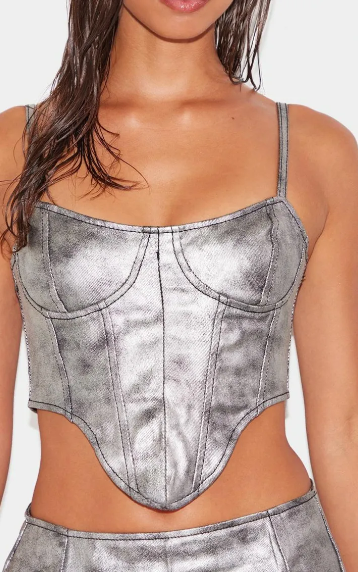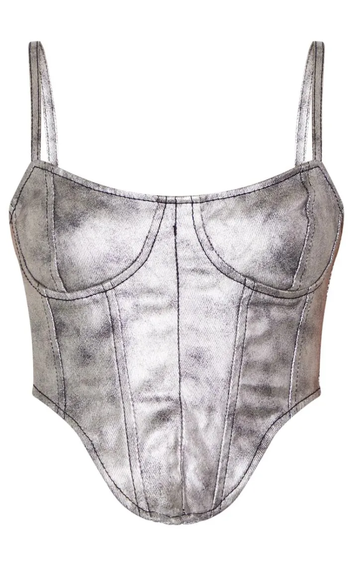 Dare to stand out from the crowd with this silver-dipped hem-coated denim corset. You are sure to be so on-trend this season, especially with this corset and is super simple design. Brought to you in a silver coated denim material with a dipped hem, how could you say no? Simply add the matching mini skirt, clear heels and silver accessories for a fresh vibe that everyone will want.