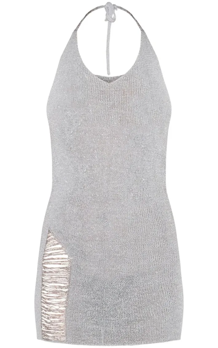 Elevate your weekend look with this silver glitter knit distressed ladder halterneck mini dress. Brought to you in a silver glitter knit material with a halterneck design, distressed ladder detailing and a mini fit, how can you resist? Style this mini dress with heels and statement accessories for a look that is sure to have eyes on you for all the right reasons.