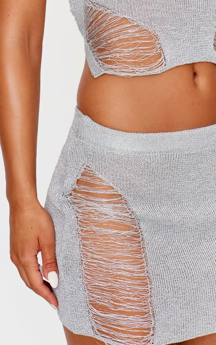 Your new season update starts here with this silver glitter knit distressed ladder mini skirt. Made from a silver hue glitter knit material with a distressed ladder design, this mini skirt is your new go-to. Team with the matching top, slip on heels and gold accessories for a chic evening finish everyone will be asking about.