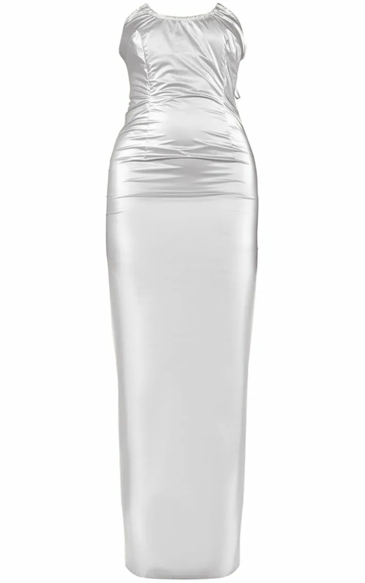 You are guaranteed to make heads turn in this silver metallic acetate pointed hem maxi dress. Brought to you in a silver hue metallic material with a pointed bandeau neckline and a figure-worshipping maxi fit, how can you not fall in love? This silver dress is sure to bring all the glam to your next occasion. Just add your highest heels and some luxe accessories for a look to be remembered.