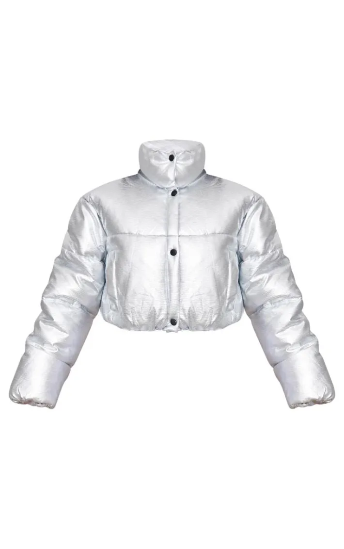 Elevate your outerwear wardrobe with this silver metallic cropped puffer jacket. Brought to you in a silver hue metallic material with a cropped length, this puffer jacket is a must have for all your styling needs. Team over a sweatpant set with sneakers for an off duty look that’s sure to get you noticed.