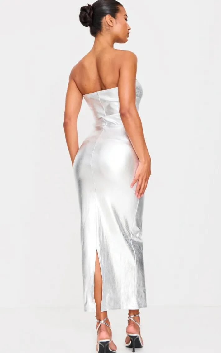 Make a statement in this silver metallic rib bandeau maxi dress. Brought to you in a silver hue metallic rib material with a bandeau neckline, this maxi dress is all the new you need. Team with slip on heels and simple accessories for a look like no other. It’s a yes from us.