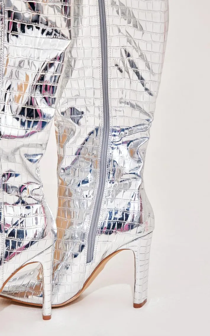 You are guaranteed to make heads turn in these silver PU croc square toe flat high heeled knee boots. Brought to you in a silver PU croc material that is sure to make you stand out from the crowd and featuring a knee high design, square to detailing and high heels, how can you not be obsessed? Simply style these knee high boots with your weekend outfit for a look that will really make a statement.