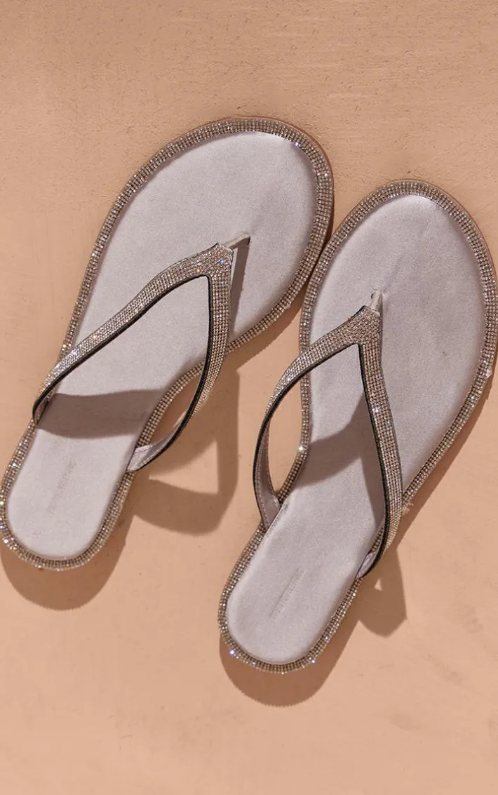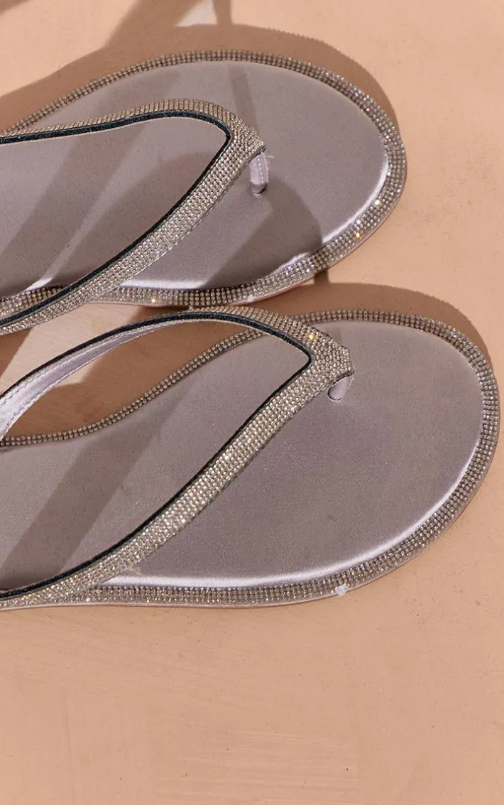 Step out in style with these silver satin round thong toe diamante trim flat sandals. These sandals are brought to you in a silver satin material with a round toe thong style and a diamante trim, how could you turn these down? Style these with your outfit of the day for a look that will have you setting trends.