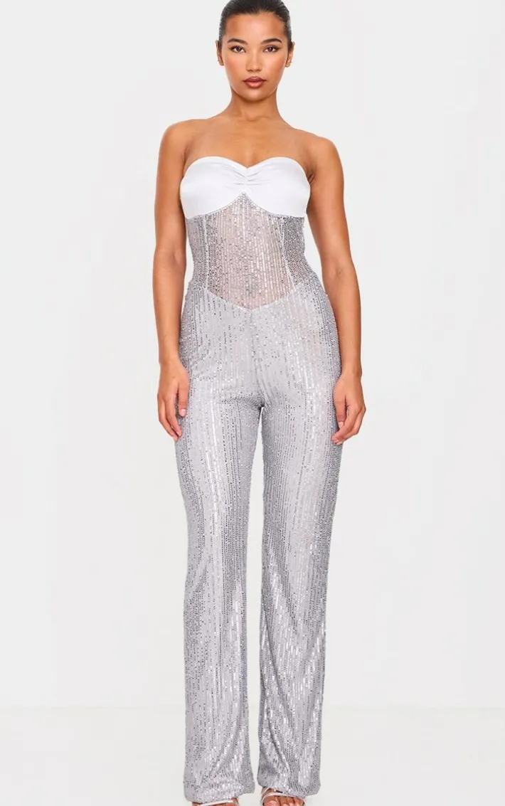Elevate your winter wardrobe with this silver sequin bandeau sheer panel jumpsuit. Brought to you in a silver material with a sequin bandeau neckline and sheer panel design, this jumpsuit is all the new you need. Team with slip on heels and simple accessories for a look that won’t go unnoticed.