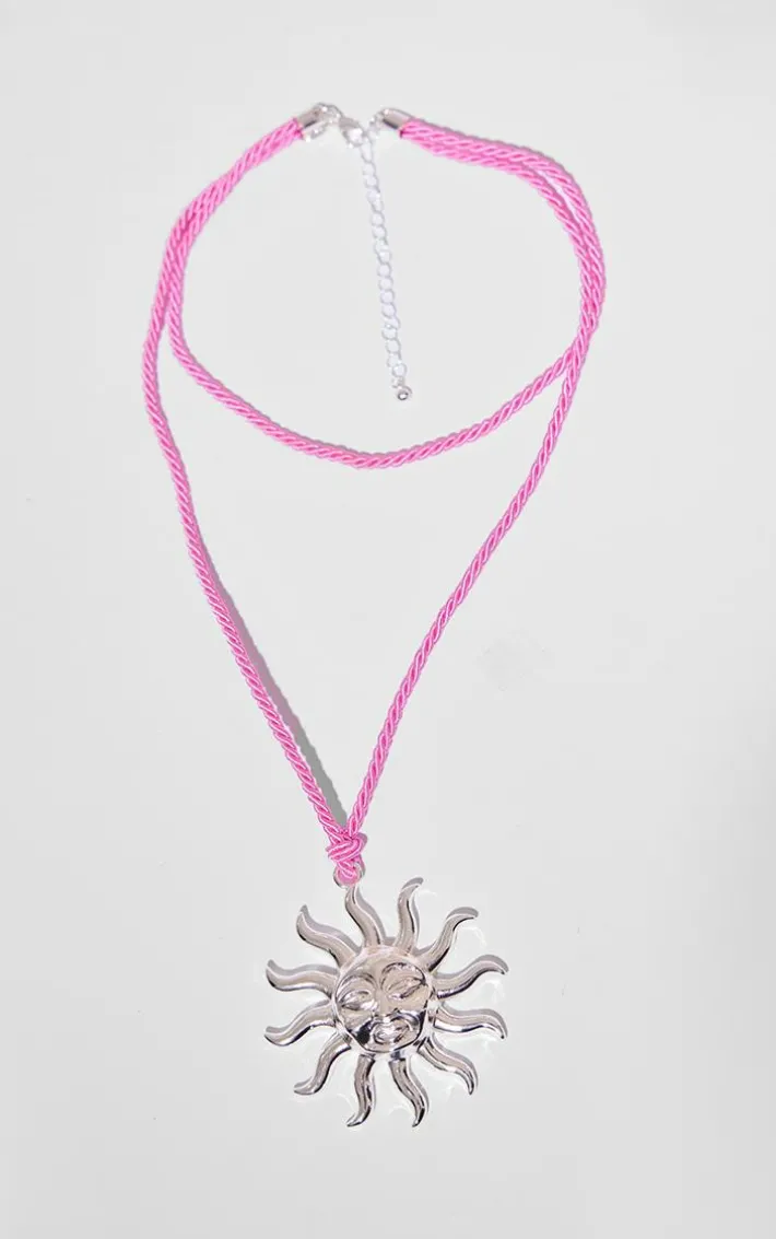 Make a statement in this silver sun detail pink rope necklace. With a pink rope chain and silver sun design, how can you not fall in love? This pink necklace is perfect for your next vacay. Simply add to your outfit of the day to instantly elevate the look.