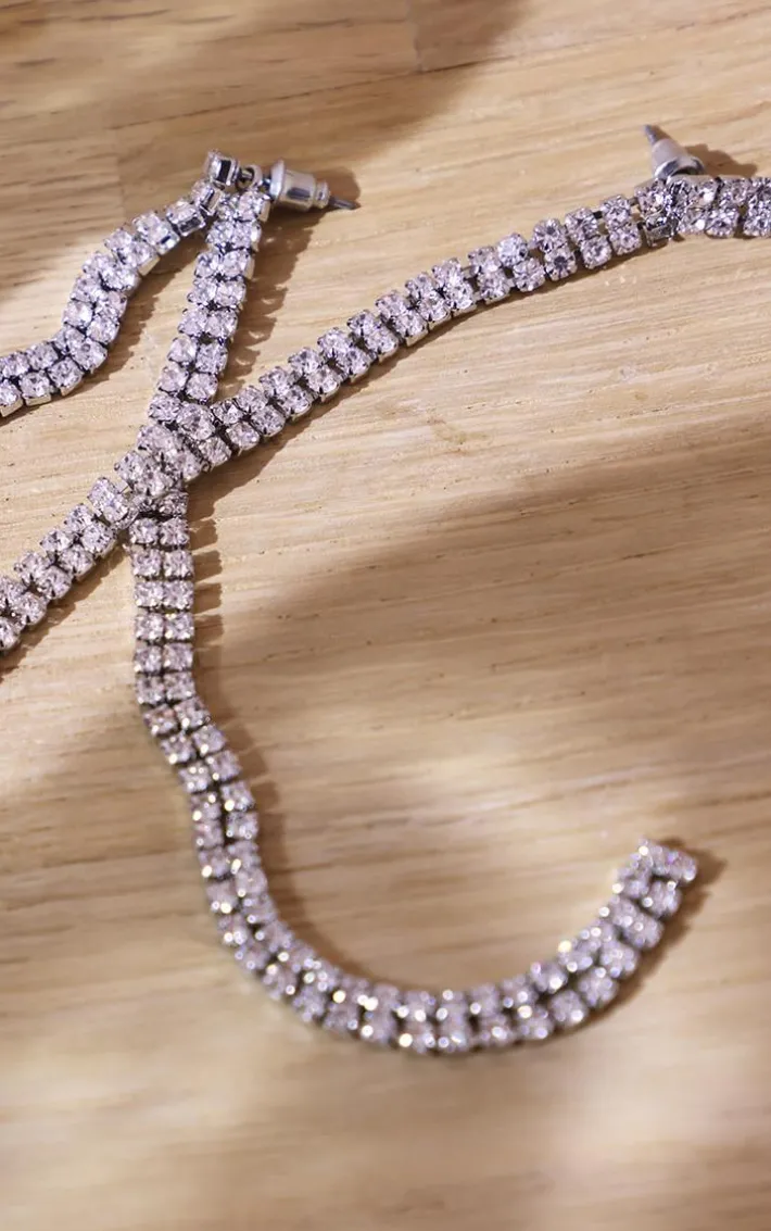 These dainty earrings are sure to be your new weekend go-to- Featuring a silver material with a thin diamante design, we are obsessed. Add to your look for an instant elevation.