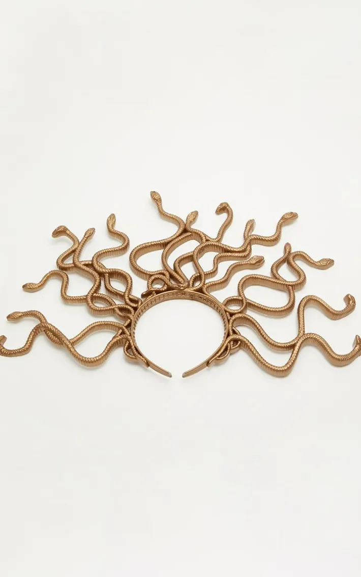 Go for a medusa vibe with this head band. Featuring a gold plastic headband with 3D snakes, team it with a medusa inspired outfit for a Halloween look we’re loving.