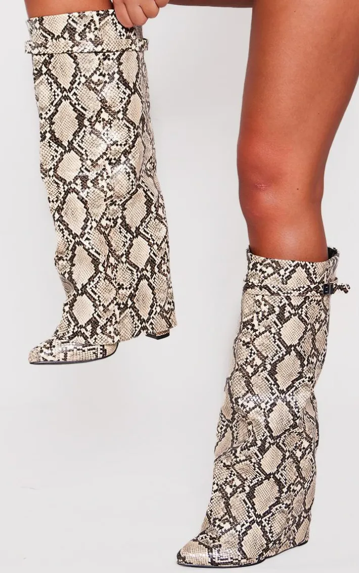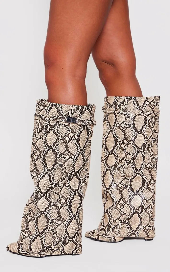 Inject some fierce animal prints into your shoe collection with these snake print PU fold over knee block heeled boots. Brought to you in a snake print PU material with a fold over design and a knee high fit, how can you not be obsessed? Style these block heeled boots with your weekend ‘fit to instantly elevate the look.