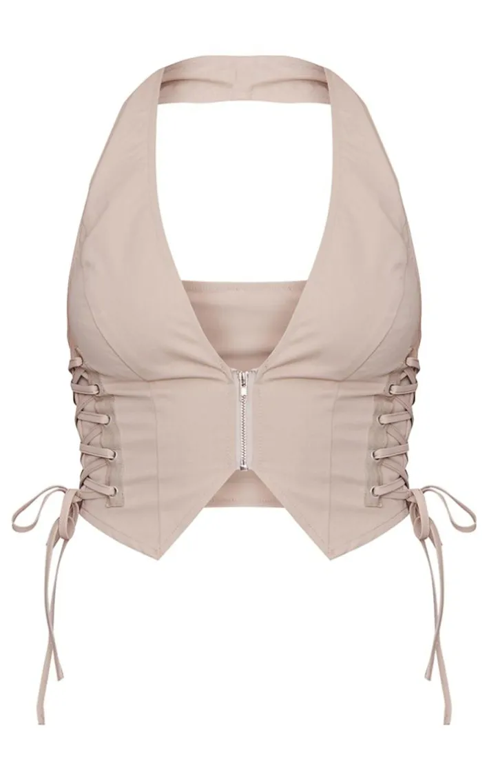 Step out in style with this stone cargo lace up side zip up crop top. This top will amp up any outfit. This crop top features a stone hue material for all the neutral vibes this season, we are obsessed. A lace up side detail is a must in your collection, with a zip up fastening, what more could you want? Team with some of your staple jeans, gold hoops and some clear heels to complete this chic look.