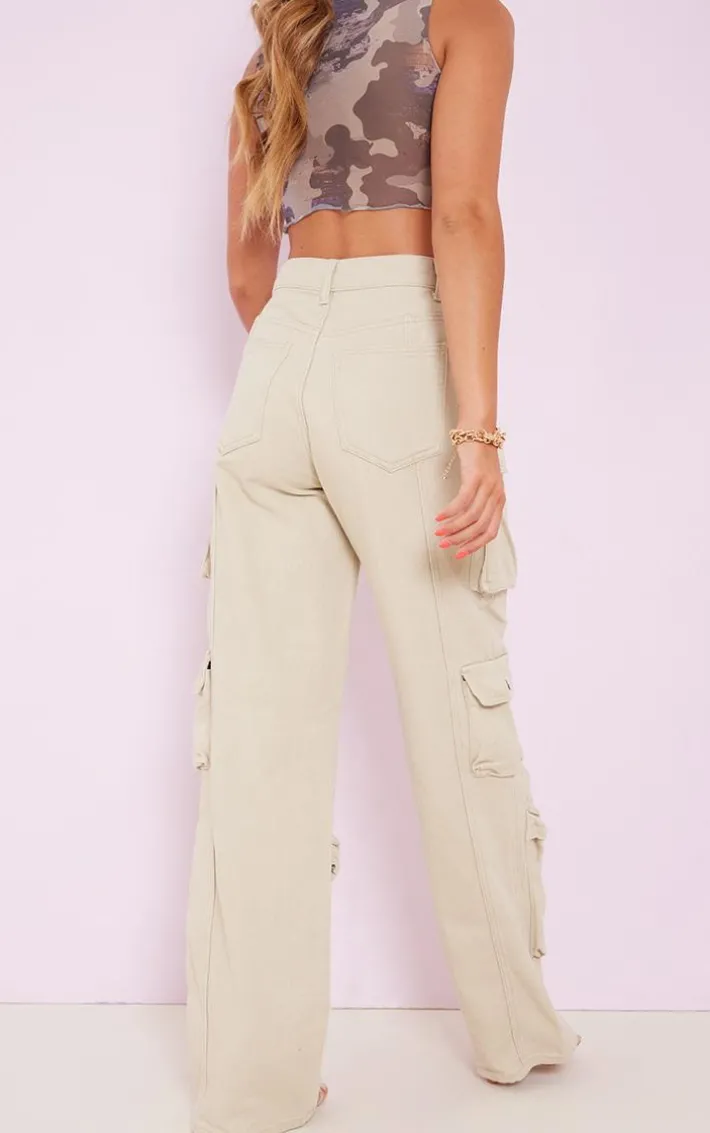 Be ready to set trends with these jeans. Featuring a stone cargo material with pocket detailing and a wide leg fit, what’s not to love? Style with a mesh print crop top and high heels to level up the look.